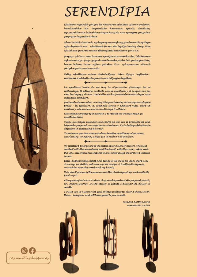 “Serendipia” es una exposición que reúne una selección de esculturas creadas a partir de la observación de la naturaleza y del estudio de las formas orgánicas de la madera. Las obras se desarrollan mediante un proceso en el que el material marca la evolución de cada pieza, permitiendo que las formas aparezcan de manera natural sin un diseño previo establecido.
